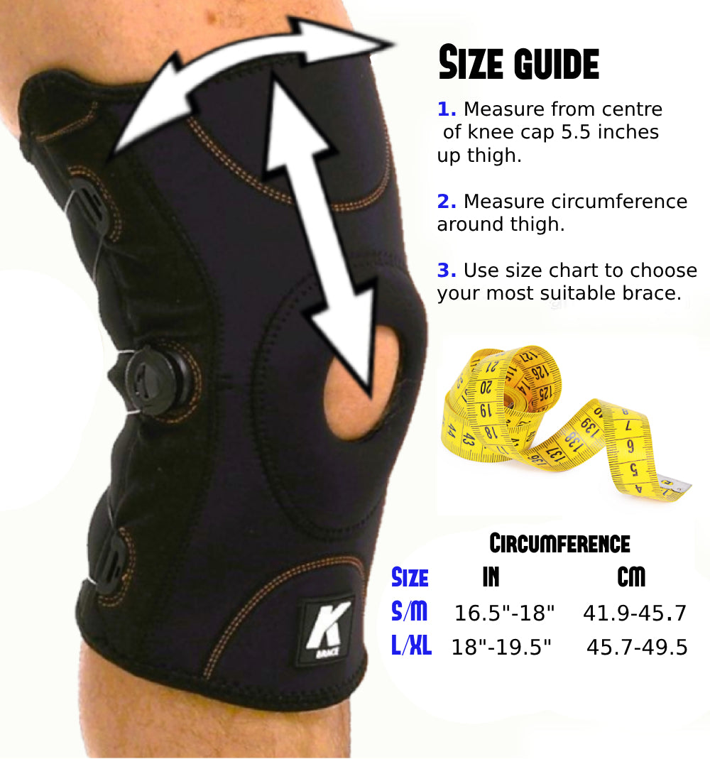To select the correct size, measure from the centre of your patella 5.5” up your thigh then measure your thigh circumference from this point. Please refer to the size guide. KBrace comes in S/M or L/XL sizes